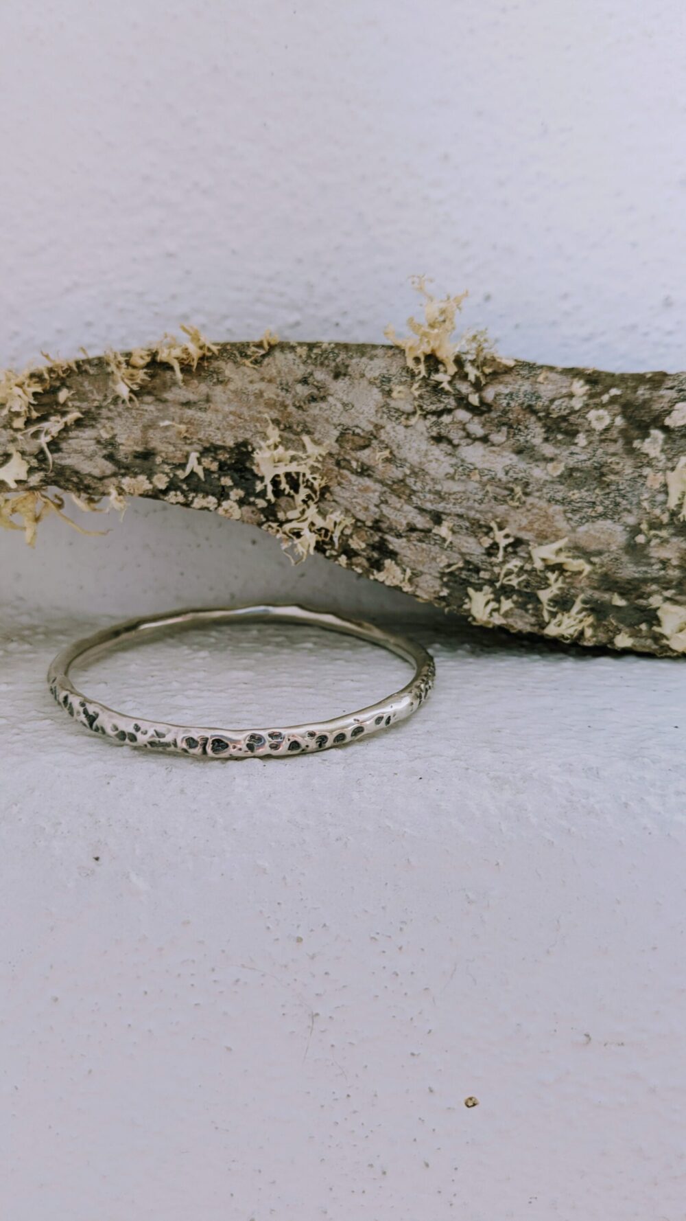 Plata de ley. Brazalete rígido. La medida del diámetro interior es de 63mm aproximadamente. Comprobar la medida con un brazalete que ya sepas que te va a tu medida.