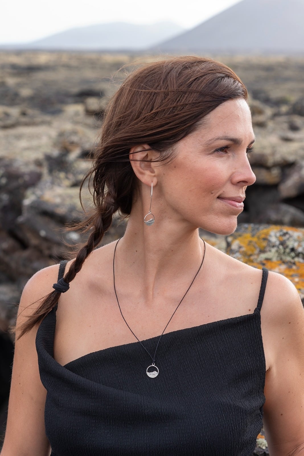 Plata de ley. El círculo con el paisaje volcánico, hecho completamente de plata, mide 17mm de diámetro aproximadamente.  El cordoncillo es de nylon negro y permite ajustar el colgante a la medida deseada.