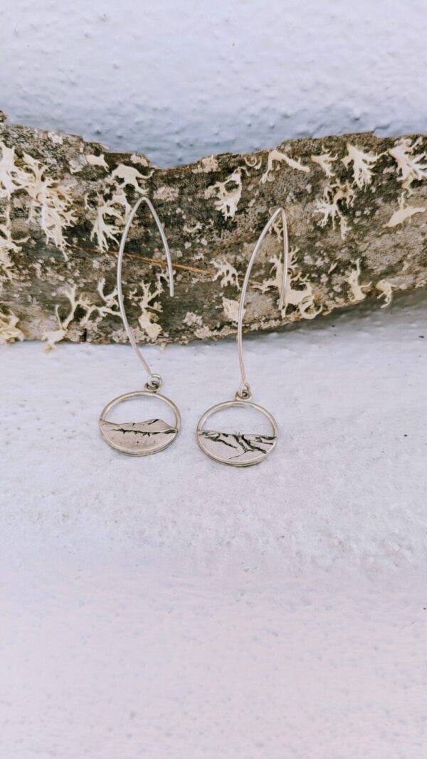 Plata de ley. El círculo con el paisaje volcánico, hecho completamente de plata, mide 17mm de diámetro aproximadamente. El largo total de los pendientes es 60mm aproximadamente.