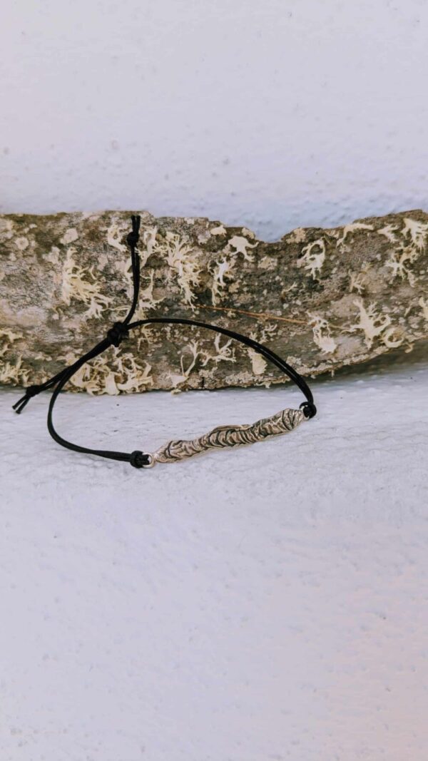 Plata de ley. La pieza central mide 40mm. El cordoncillo es de nylon negro y permite ajustar la pulsera a la medida deseada.